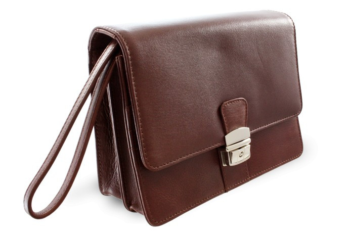 Schwarzes Etui mit 2 durch Reißverschluss getrennten Fächern, 4 Kreditkartenfächern, 2 Reißverschlussfächern und 1 Innenfach, abnehmbarem Schlüsselring, Reißverschluss-Außentasche, Handschlaufe. Grundmaße 22 x 17 x 8 cm. Material NDM, Farbe braun.