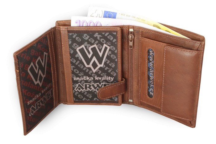 Herren Lederportemonnaie Arwel in Dunkelbraun. Die Geldbörse enthält eine Innenschließe, 2 Einlegeblätter, 2 Geldscheinfächer, ein Münzfach, 9 Kreditkartenfächer, 2 Innen- und 3 Klarsichtfächer in Ausweisgröße, 1 Reißverschlussfach. Grundmaße 9,5 x 13 cm. Material SVG, Farbe dunkelbraun.
