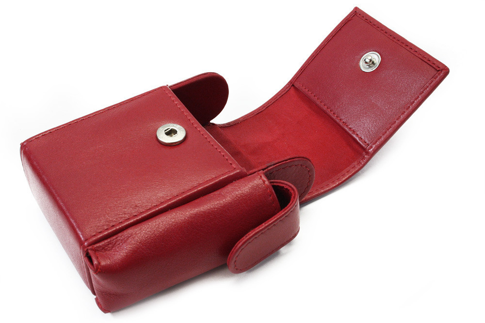 Das Zigarettenetui aus Leder für Damen hat ein Hauptfach, das durch eine Klappe mit Druckknopf gesichert ist. Es ist mit einer Seitentasche für ein Feuerzeug ausgestattet.