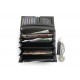 Kellnerbörse mit Kette und Gürtelclip, Verschluss in drei Positionen je nach Füllungsgrad, 7 Geldscheinfächer, 2 Reißverschlussfächer für Münzen, 1 Klarsichtfach. Grundmaße 19,5 x 10,5 cm. Material PDM, Farbe schwarz.