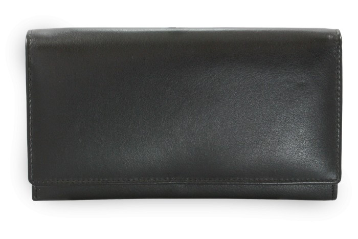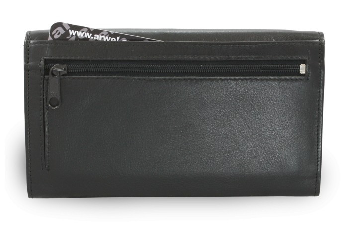 Arwel Damen Clutch Lederportemonnaie mit Klappe in Schwarz. Das Portemonnaie enthält ein breites Geldscheinfach, ein Münzfach mit Klappe, 6 Kreditkartenfächer und 3 große Innentaschen, 1 Reißverschlussfach, 1 Reißverschlussfach und 1 offenes Fach auf der Rückseite. Grundmaße 18 x 10 cm. Material NAPPA, Farbe schwarz.
